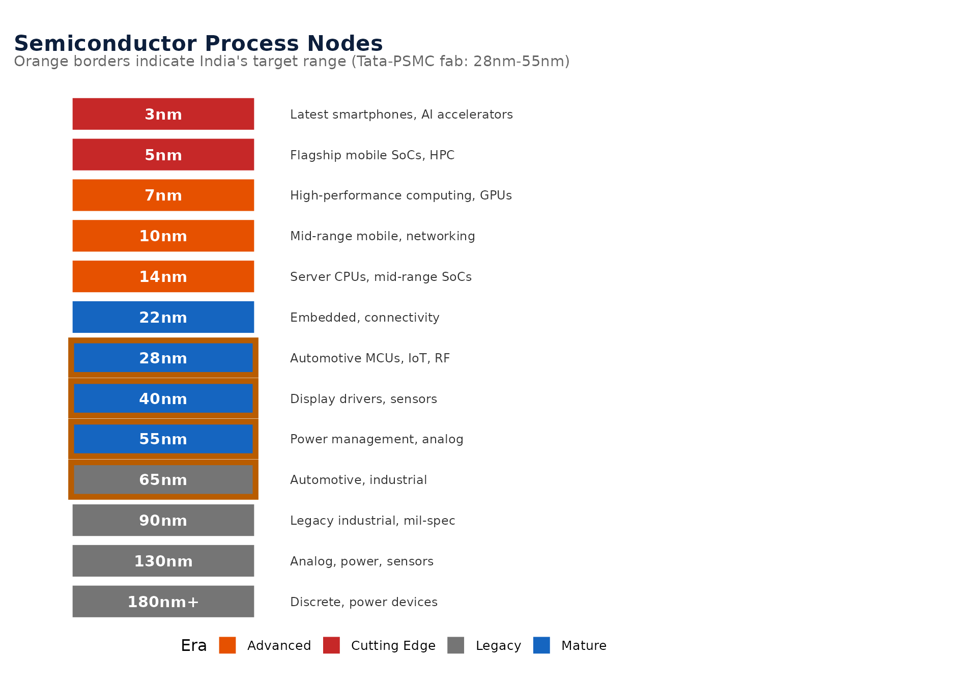 These are the chips that India imports in massive quantities today. Building domestic capacity at these nodes directly addresses import dependence.