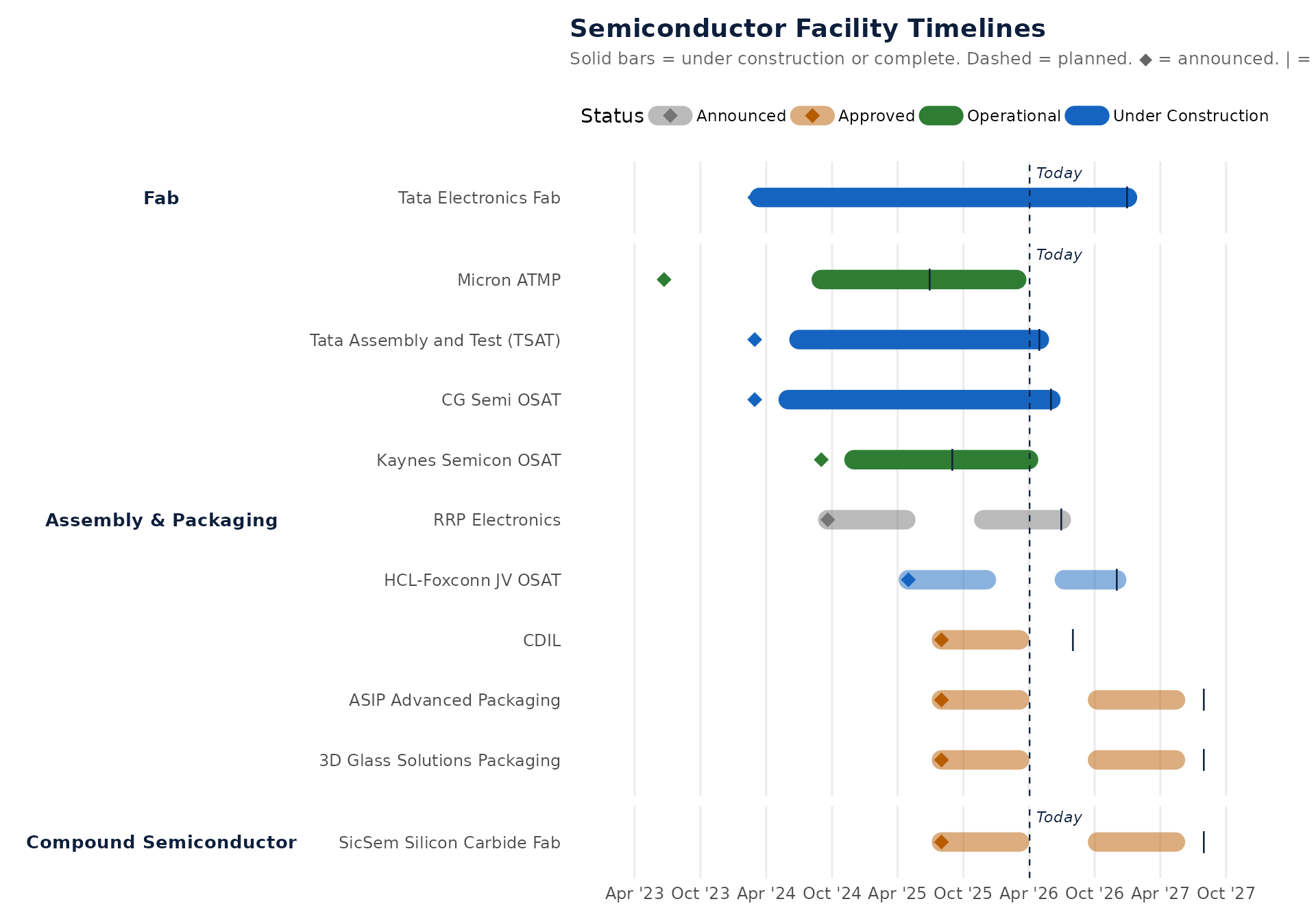 Each row represents a facility. Bars show the span from construction start (or announcement, if construction hasn’t begun) to expected or actual completion. Diamond markers (◆) mark the announcement date. Vertical ticks (|) show the original target completion date where known. The dashed line marks today.
